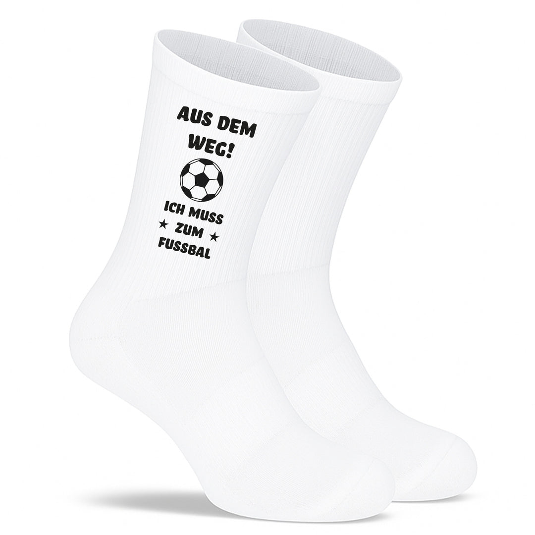 Socken „Aus dem Weg. Ich muss zum Fußball“ | Lustige Fußball-Socken | Geschenk für Fußballfans & Kicker